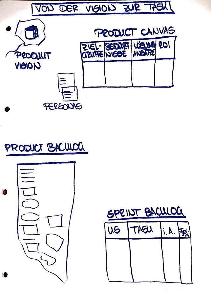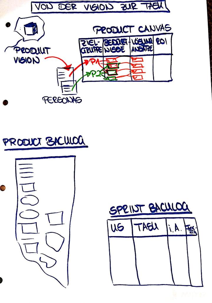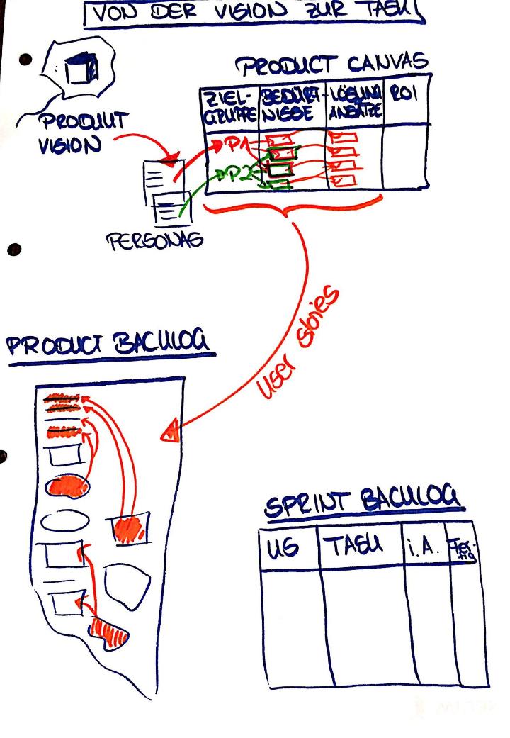 - Pfeil von der Klammer zum Product Backlog zeichnen und „User Story“ hinschreiben: die User Stories werden in das Product Backlog aufgenommen und dort entsprechend weiter detailliert, priorisiert, sortiert, bis sie zu den TOP priorisierten User Stories gehören