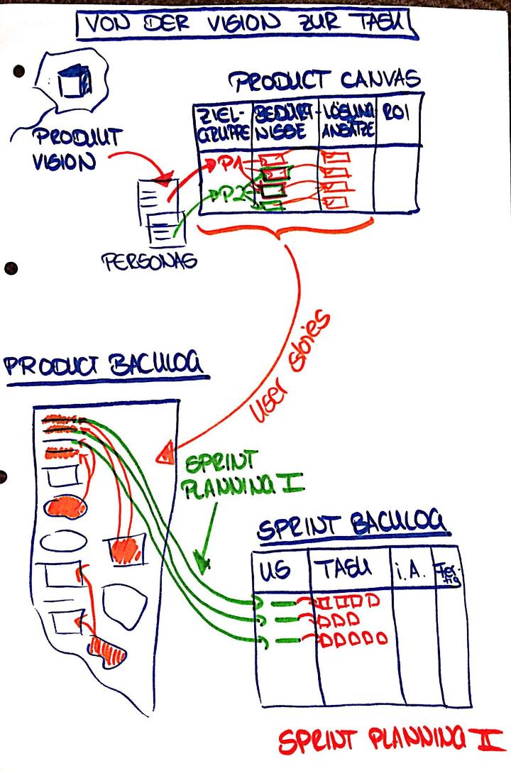 So kommt man von einer ursprünglichen Product Vision zu den schlussendlich umzusetzenden Aufgaben.