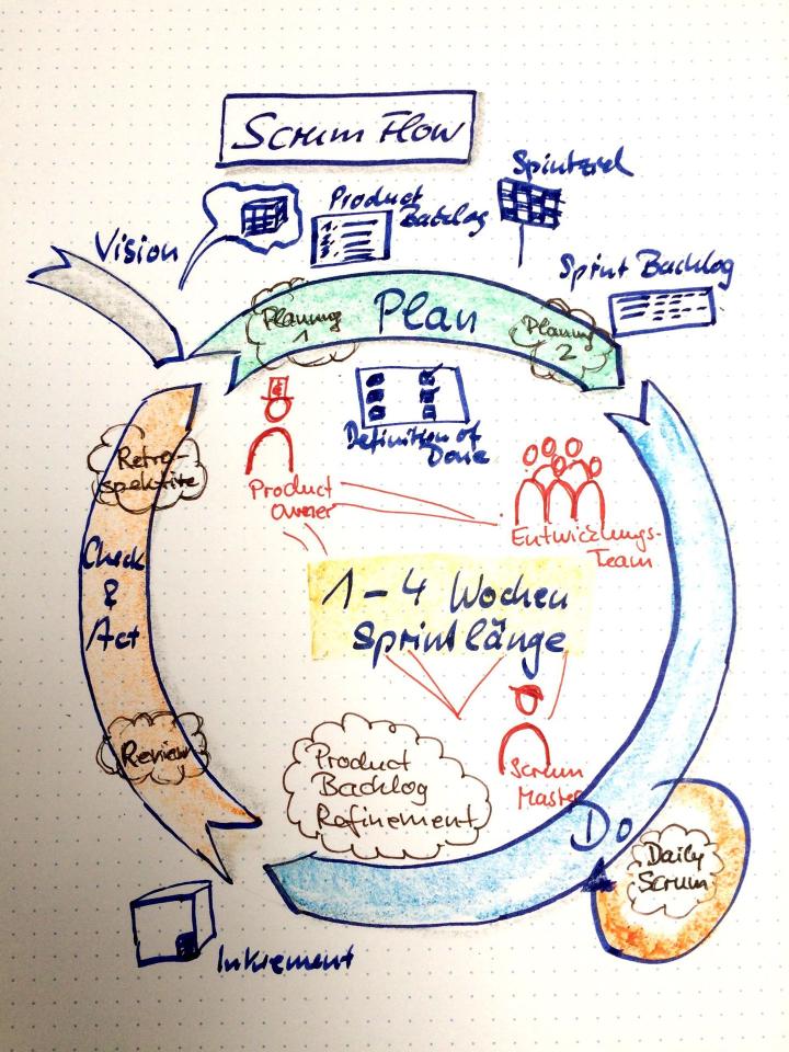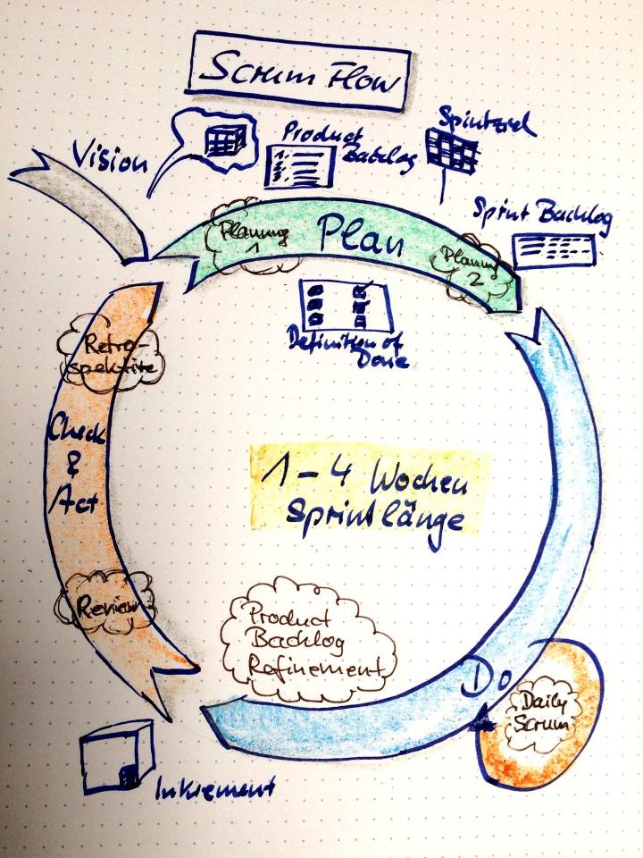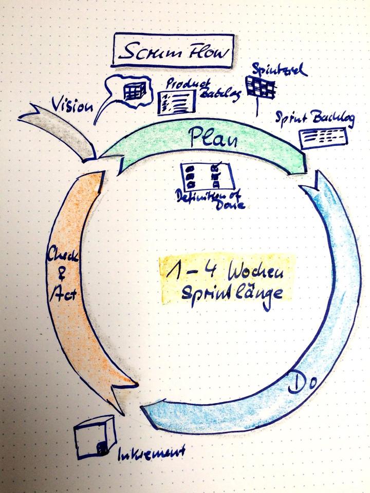 Die vier Phasen sind somit als kontinuierlicher Prozess der Verbesserung zu verstehen. In diesen PDCA-Zyklus werden Schritt für Schritt die Kernelemente von Scrum integriert. Als erstes wird die Besonderheit der relativ kurzen Sprintlänge verdeutlicht. Beginnend mit der Vision wird erklärt wie die Artefakte gedacht sind und in diesem Flow zusammen spielen: