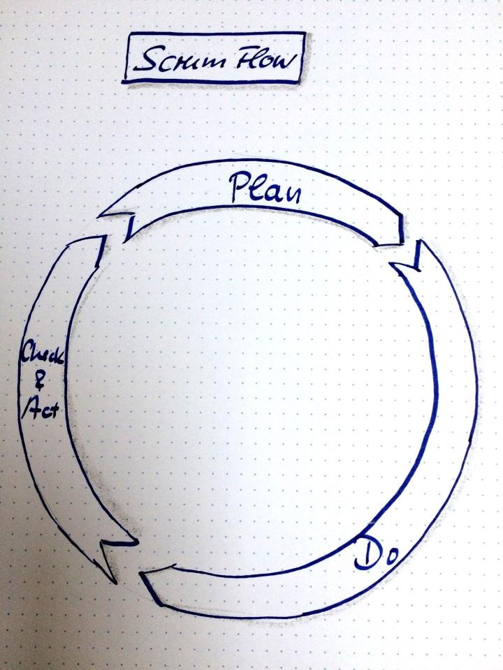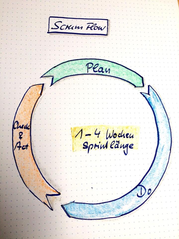 Der Scrum Flow wird hier ausgehend vom PDCA-Zyklus von Deming erklärt (Plan-Do-Check&Act). Den PDCA-Zyklus kennen viele Projekt- und Qualitätsmanager aus der klassischen Projektarbeit als Problemlösungsprozess. Damit können “alte Hasen” an vertrautes Wissen anknüpfen und es macht den Zugang zu Scrum evtl. einfacher. Das Akronym PDCA kommt aus dem Englischem und steht für: