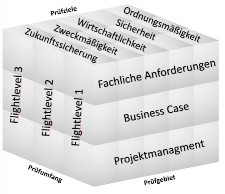 Dieser Würfel hilft insbesondere in der Planung einer Prüfung bei der passenden Justierung von Prüfungsumfang, Prüfungsgebiet und Prüfungsziel. Für einen strukturierten Umgang mit agilen Organisationen kann es helfen, diesen Würfel anzupassen. Hier kann das Modell der Fligthlevel in die Dimension des Prüfungsumfangs integriert werden: