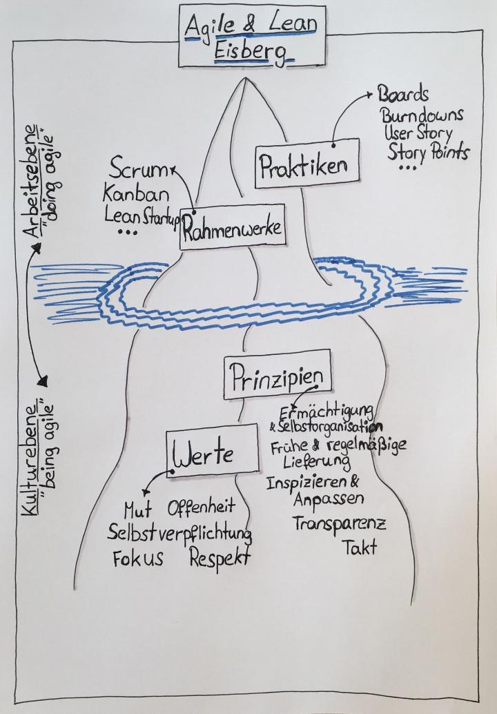 The Cultural level is located below the surface of the water, as it is not readily perceptible from the outside, but essentially determines attitude, actions and behavior. The five values from the Scrum Guide are essential for an agile culture: